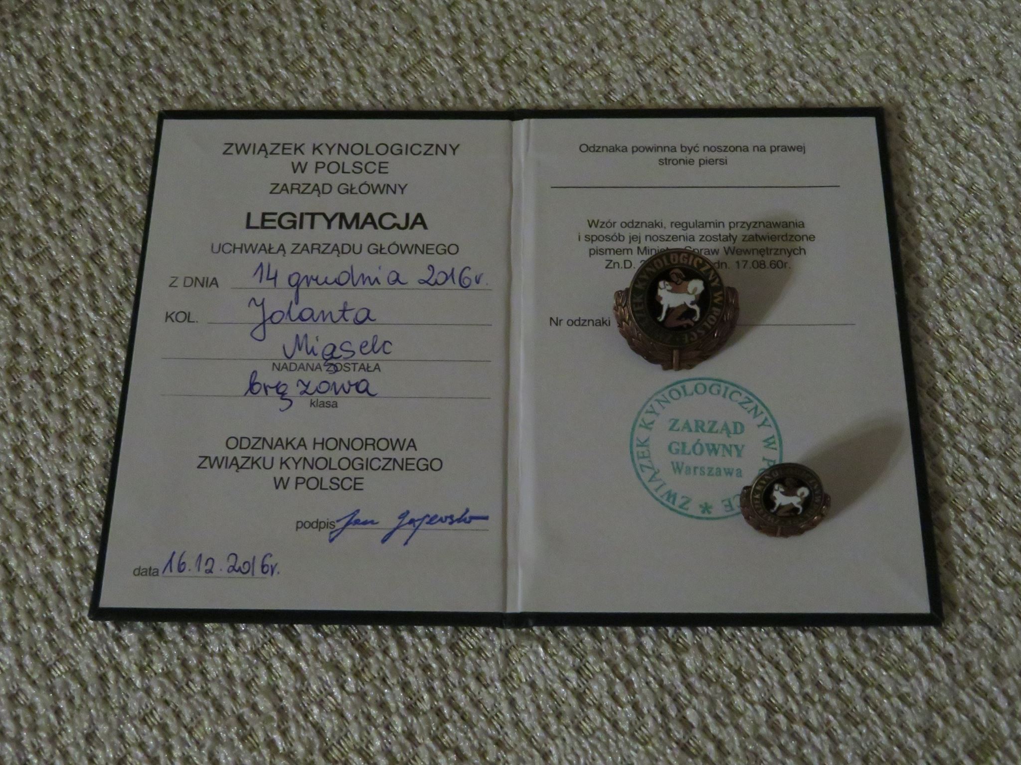 Nie tylko miłośnicy rasy z zagranicy zauważyli nasze starania związane z promocją i popularyzacją rasy. Nasze zaangażowanie, oraz wystawowe sukcesy naszych psów, dostrzegł też Związek Kynologiczny w Polsce i w roku 2016 zostałam nagrodzona "Brązową Honorową Odznaką Związku Kynologicznego w Polsce".