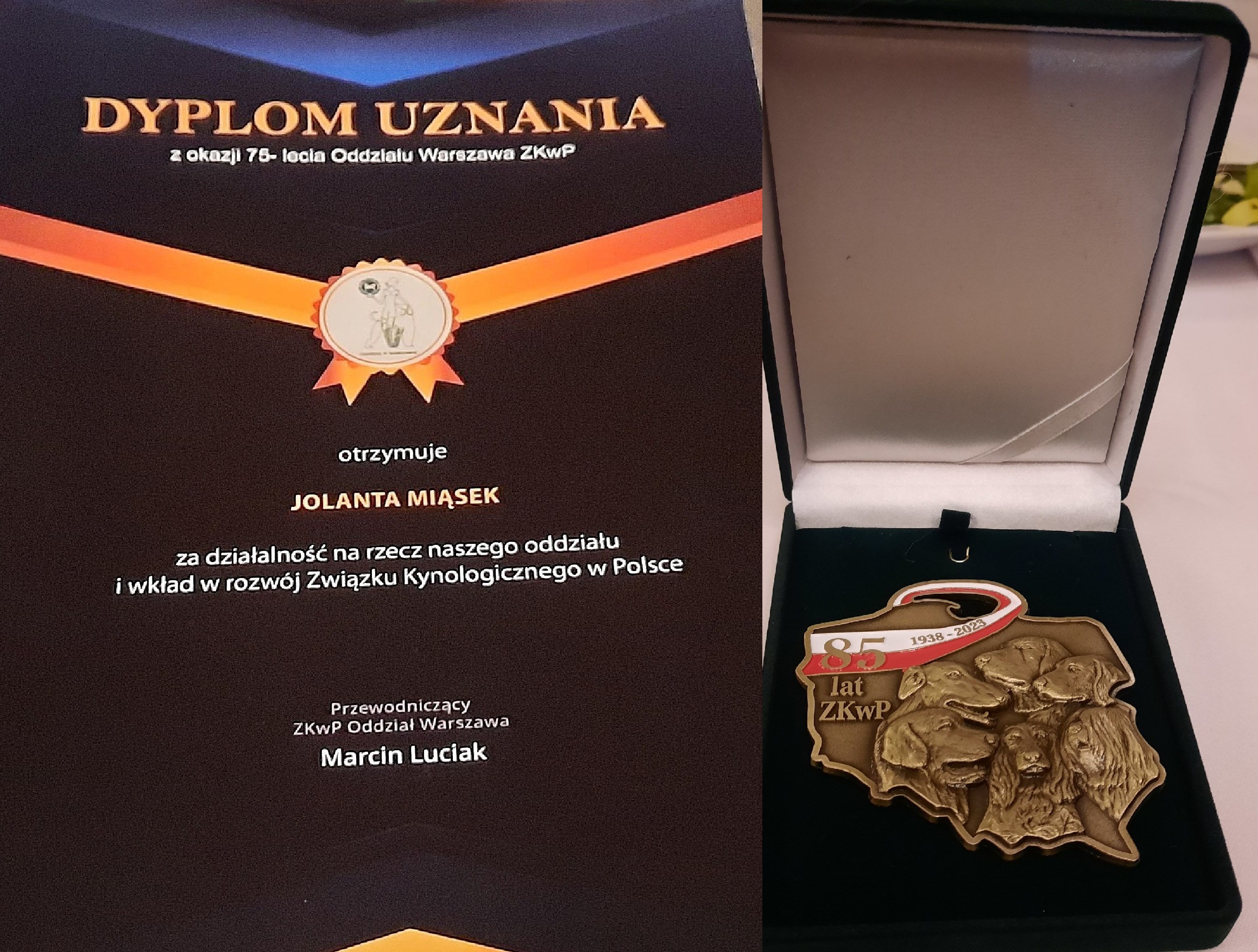 Rok 2023 był dla ZKwP szczególny. Związek Kynologiczny w Polce Oddział Warszawa obchodził 75-lecie powstania, zaś sam Związek Kynologiczny w Polsce obchodzi w 2023r. swoje 85-lecie! Z tej okazji odbyło się uroczyste spotkanie. Wielką niespodzianką i zaszczytem dla mnie było uhonorowanie mojej skromnej osoby dyplomem uznania za działalność na rzecz oddziału i wkład w rozwój kynologii oraz okolicznościowym medalem Związku Kynologicznego w Polsce.