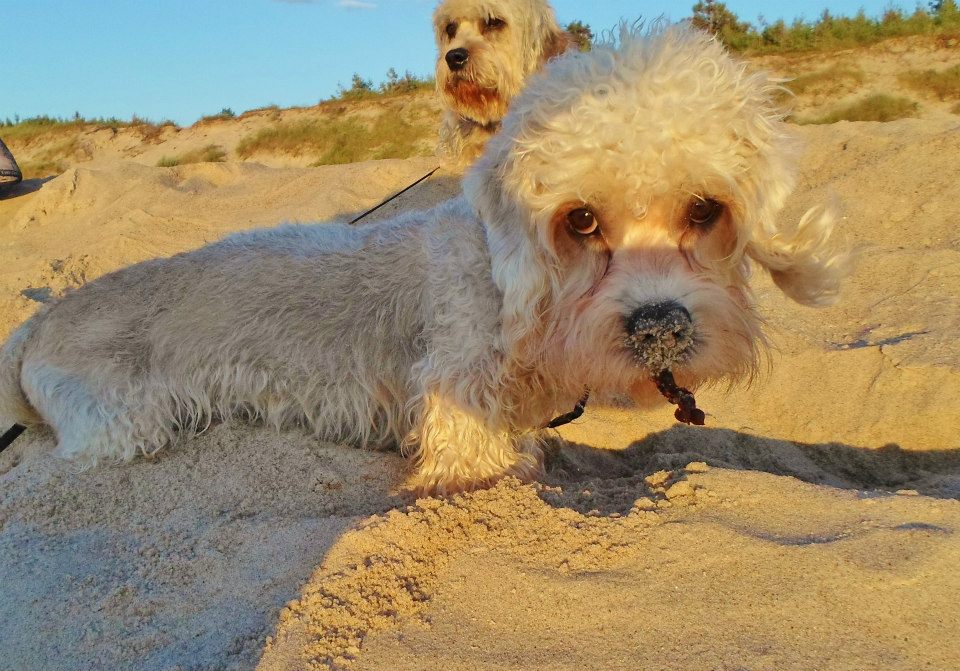 Plaża i dandusiowe wakacje. W tle Brutusek, na pierwszym planie Szejkuś ze zdobycznym wodorostem.