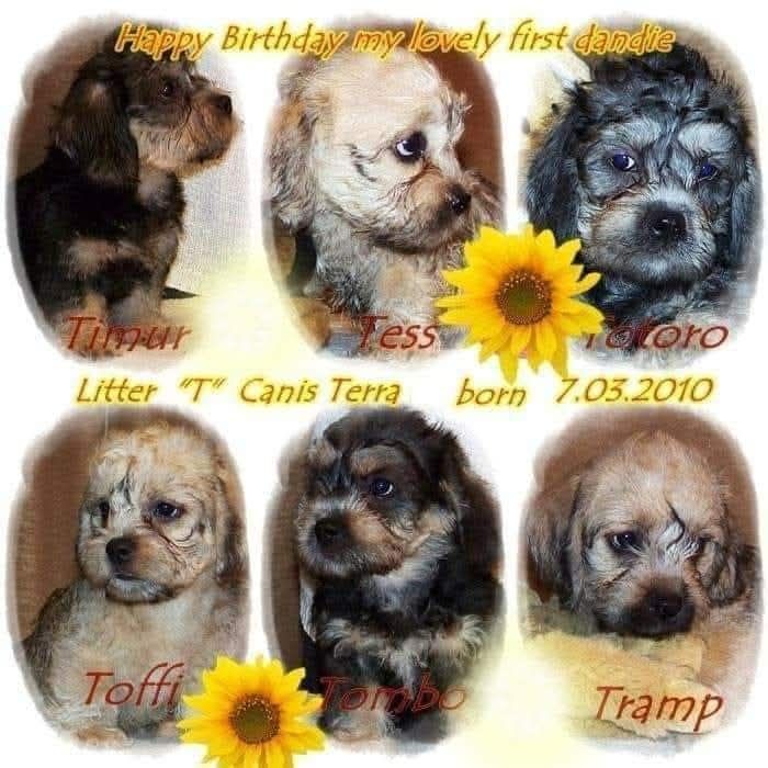 Pierwszymi maluchami jakie powitaliśmy był miot T urodzony 07.03.2010 r. Ponieważ był to pierwszy miot dandie w Polsce po wielu latach przerwy, stanowił nie lada sensację, ukazał się nawet artykuł w prasie. Urodziło się sześć brzdąców. TESS - jedyna dziewczynka i pięciu kawalerów: TOTORO, TIMUR, TPRAMP, TOFFI i TOMBO. Niestety nie zachowały się albumy tych malców, jednie ta kartka urodzinowa jaką dla nich zrobiłam.